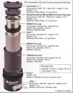 Ein Topfset aus ultraleichtem Titanium für UL-Geher, solo oder genügsame 2. Gewicht 260 g für ein 4-teiliges Topf-Set.