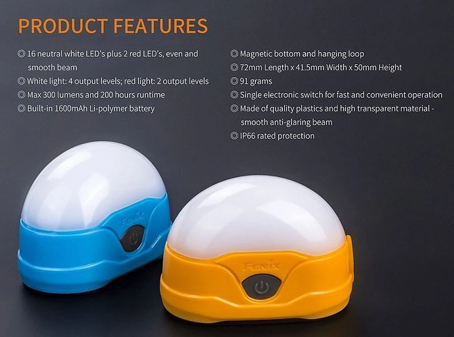 ie Fenix CL20R ist eine wiederaufladbare Campingleuchte, mit neutralweißen und roten LEDs. Leuchtleistung in 6 Stufen regulierbar, maximale Leistung 300 Lumen.