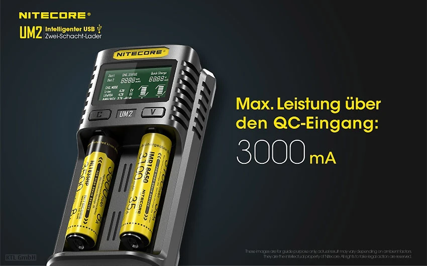 Der Nitecore UM2 ist ein intelligenter, QC 2.0 kompatibler USB-Lader mit zwei Ladeschächten und LCD-Display.