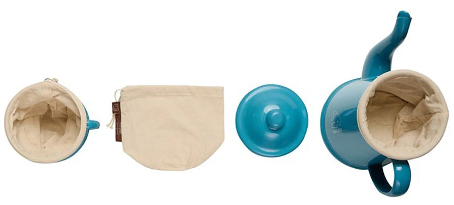 Das Set ist im klassischen dänischen Madam Blå Design aus Emaille. Es beinhaltet die Kaffeekanne und einen Aufsatz-Filter, der mit Baumwoll-Filter-„Tüte“ preisgünstig (weil dauerhaft) eben Filterkaffee produziert.