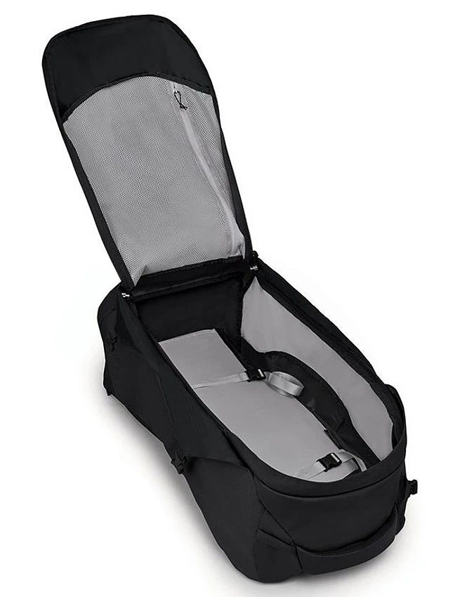 • Verstaubare Rückenplatte, Hüft- und Schultergurte – hinter einer RV-gesicherten Abdeckung