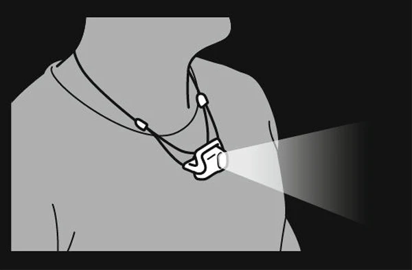 - Wenn die Lampe um den Hals getragen wird, kann der Lampenkörper nach oben geschwenkt werden, um den Weg auszuleuchten