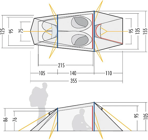 Gestänge 7001/T6 Alu eloxiert, 9.5 mm. 2 Bögen - Innenzeltmaße: Länge 215 cm, Breite 135 cm bzw. 75 cm, Höhe 100 cm bzw. 76 cm